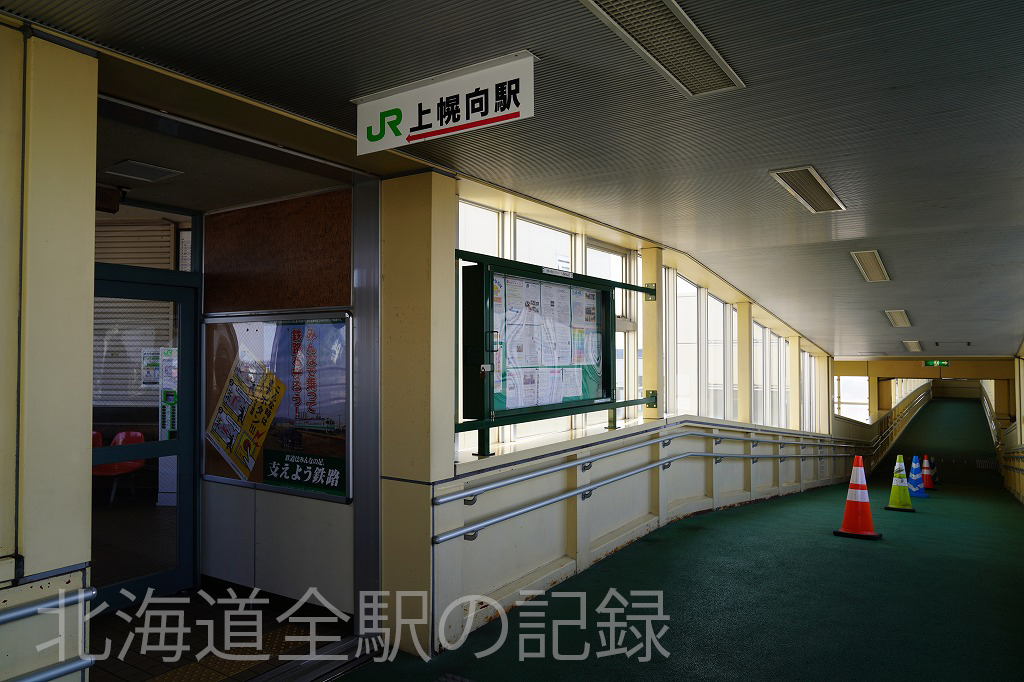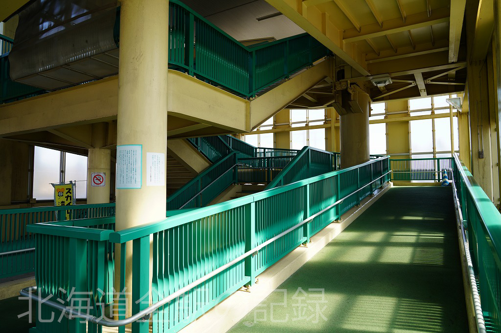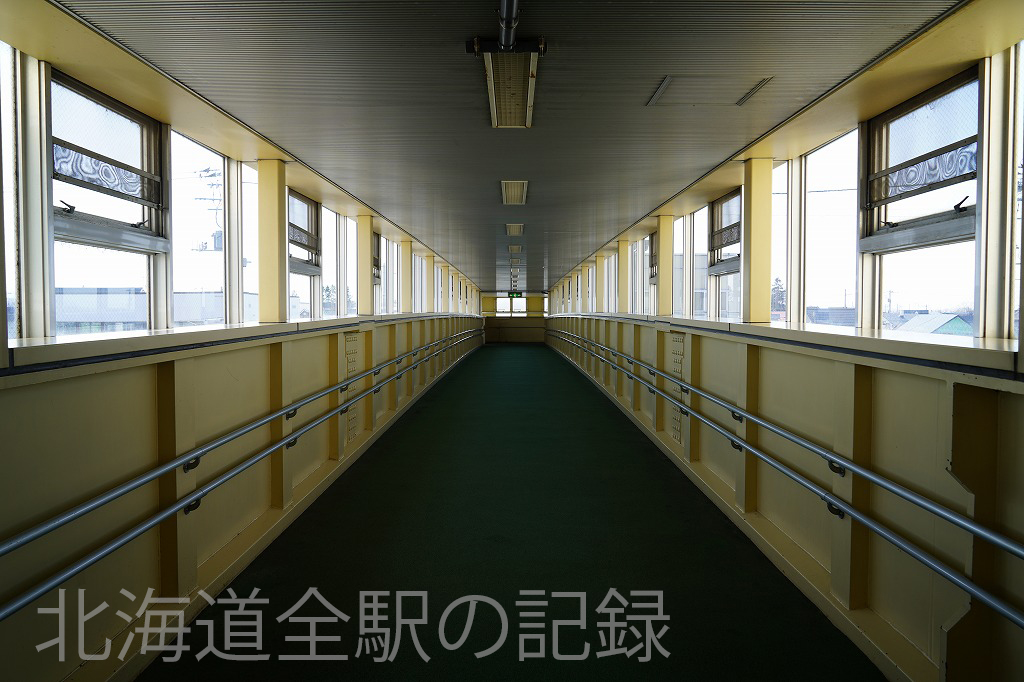長い跨線橋の途中に改札口への入口がある