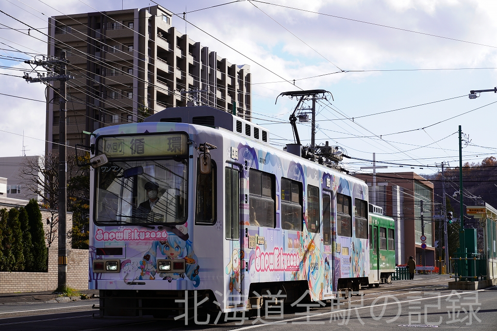 雪ミク電車が電車事業所前駅を出発する