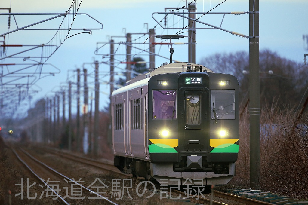 沼ノ端から白老まで28.7km続くまっすぐの直線区間を行く737系