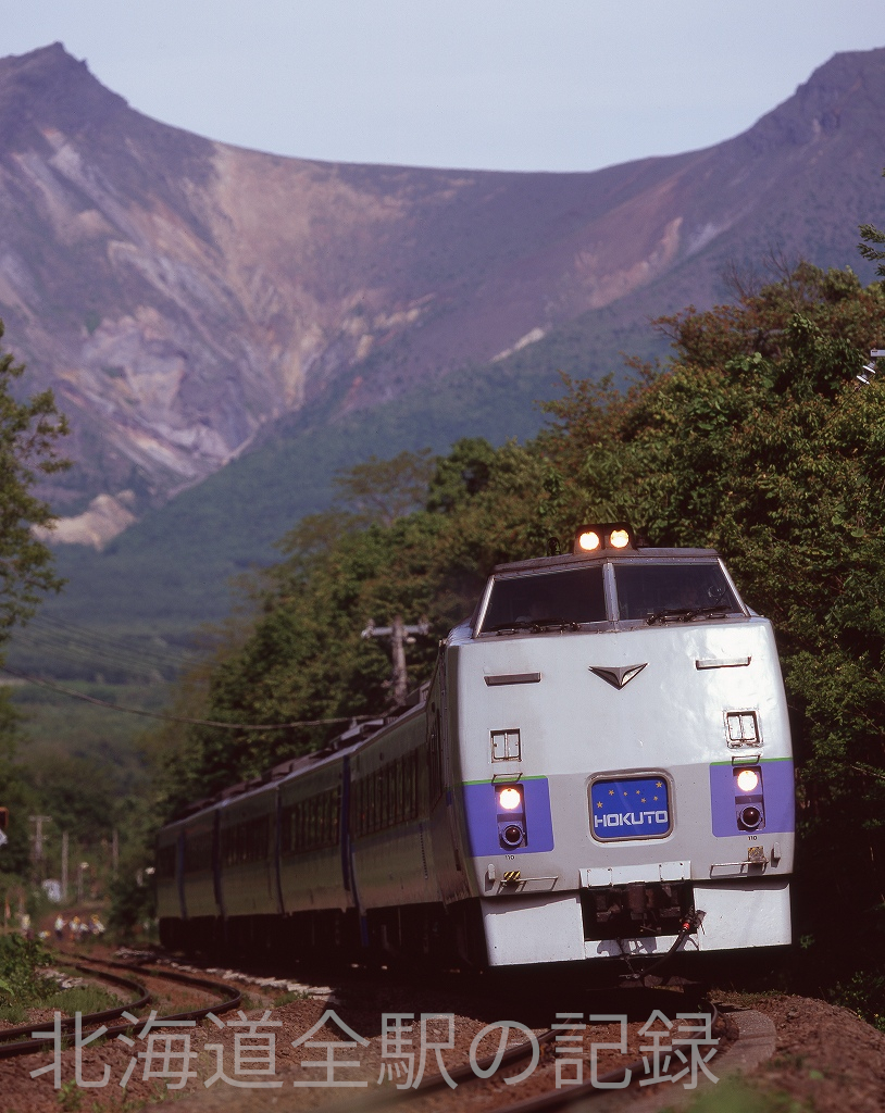 駒ヶ岳をバックに姫川駅を通過するキハ183臨時北斗
