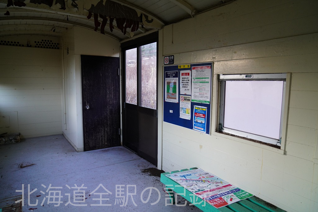 地元中学生デザインのイラスト。貨車駅ながら出入しやすいようアルミサッシの改造がなされている。廃止後も駅舎内に入られる