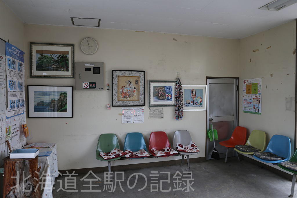 駅待合室内はアットホームな地域の空間となっている。2022年4月22日からは駅名標にはユニークな牛のオブジェが飾られている