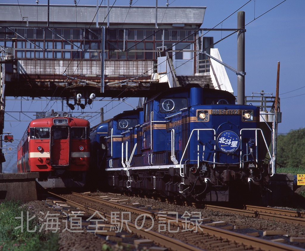 特徴的な旧駅舎。おりしも臨時北斗星と赤電車がすれ違い