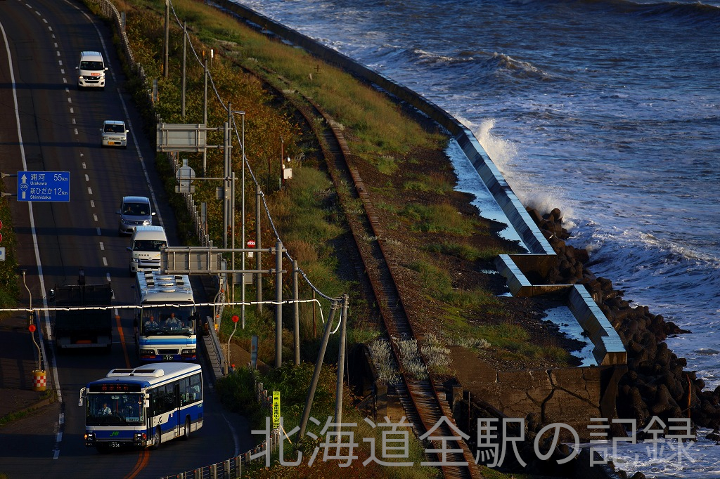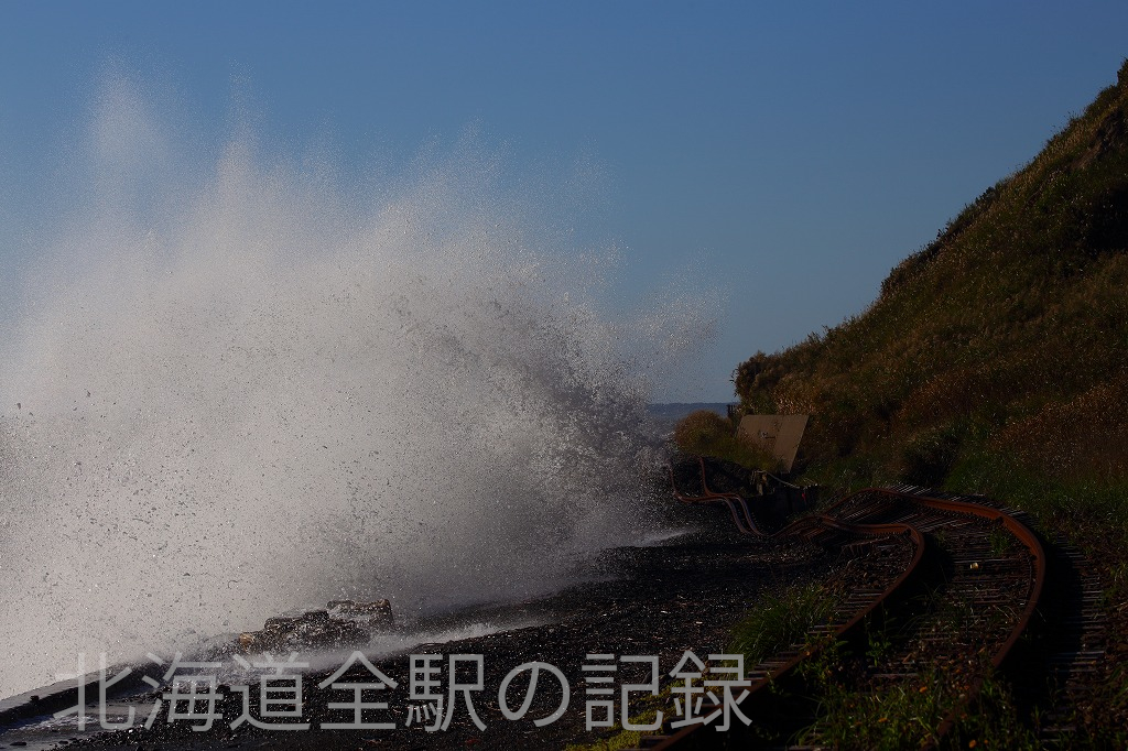 海がぎりぎりに迫る秘境駅。厚賀駅側の線路は高波によりえぐり取られている