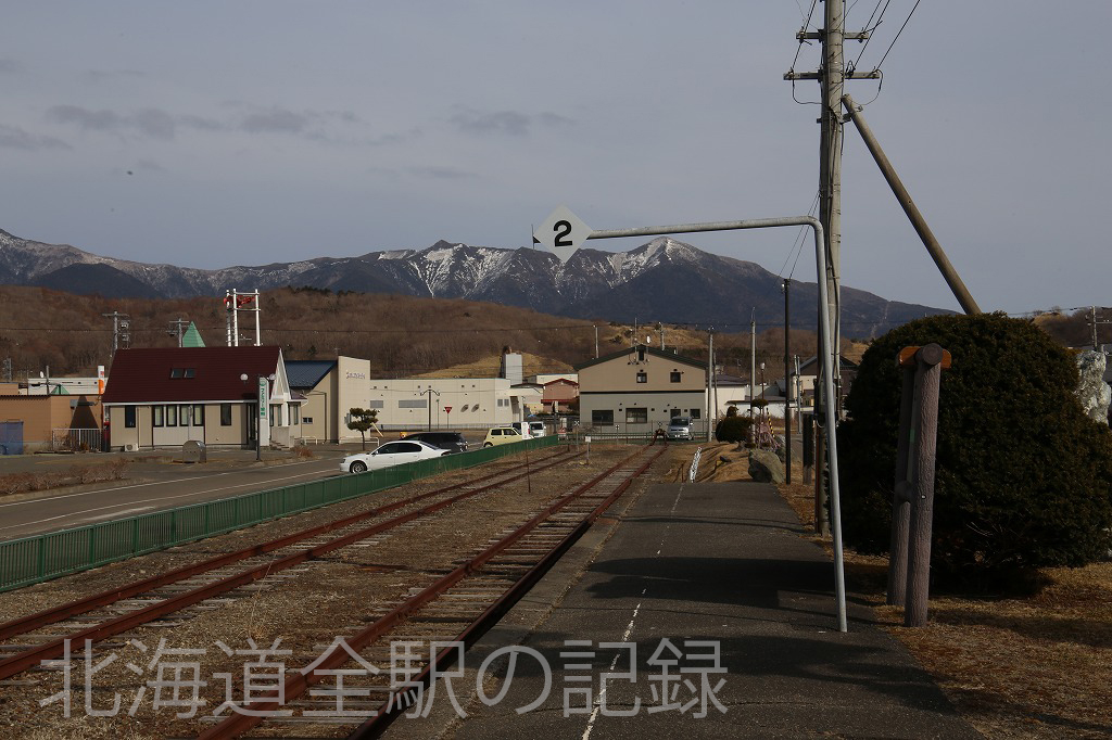 駅の向こうにアポイ岳がそびえる