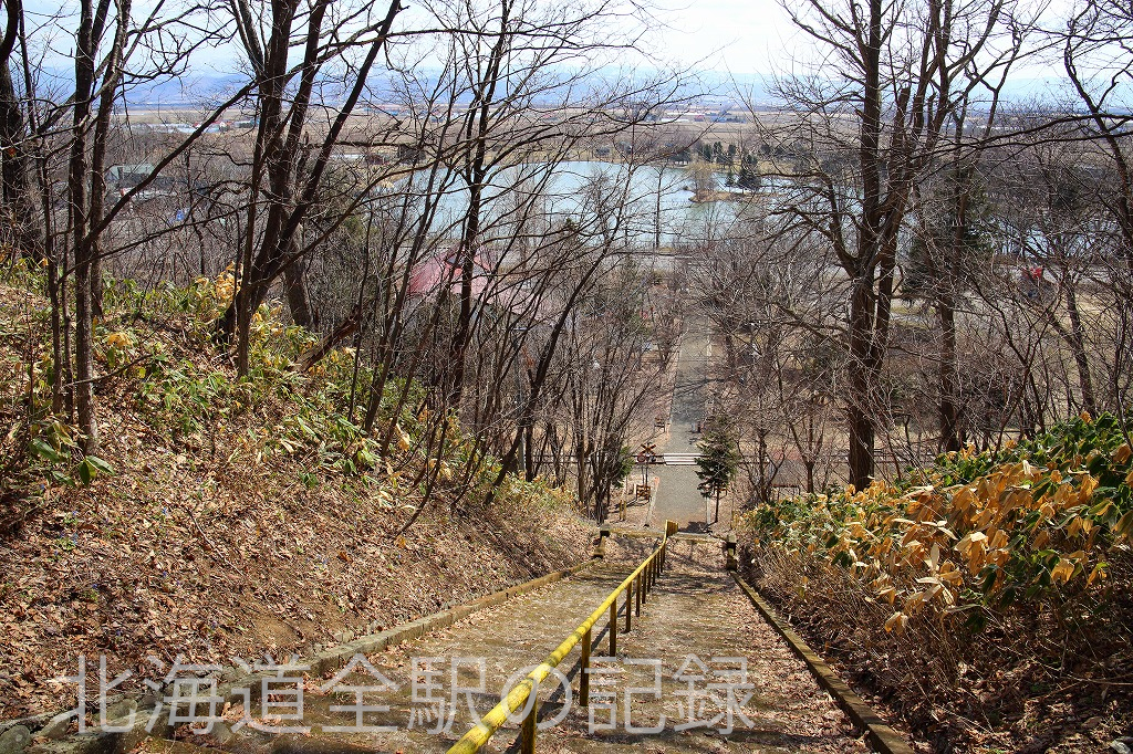 浦臼神社の階段から見た線路。バックは鶴沼